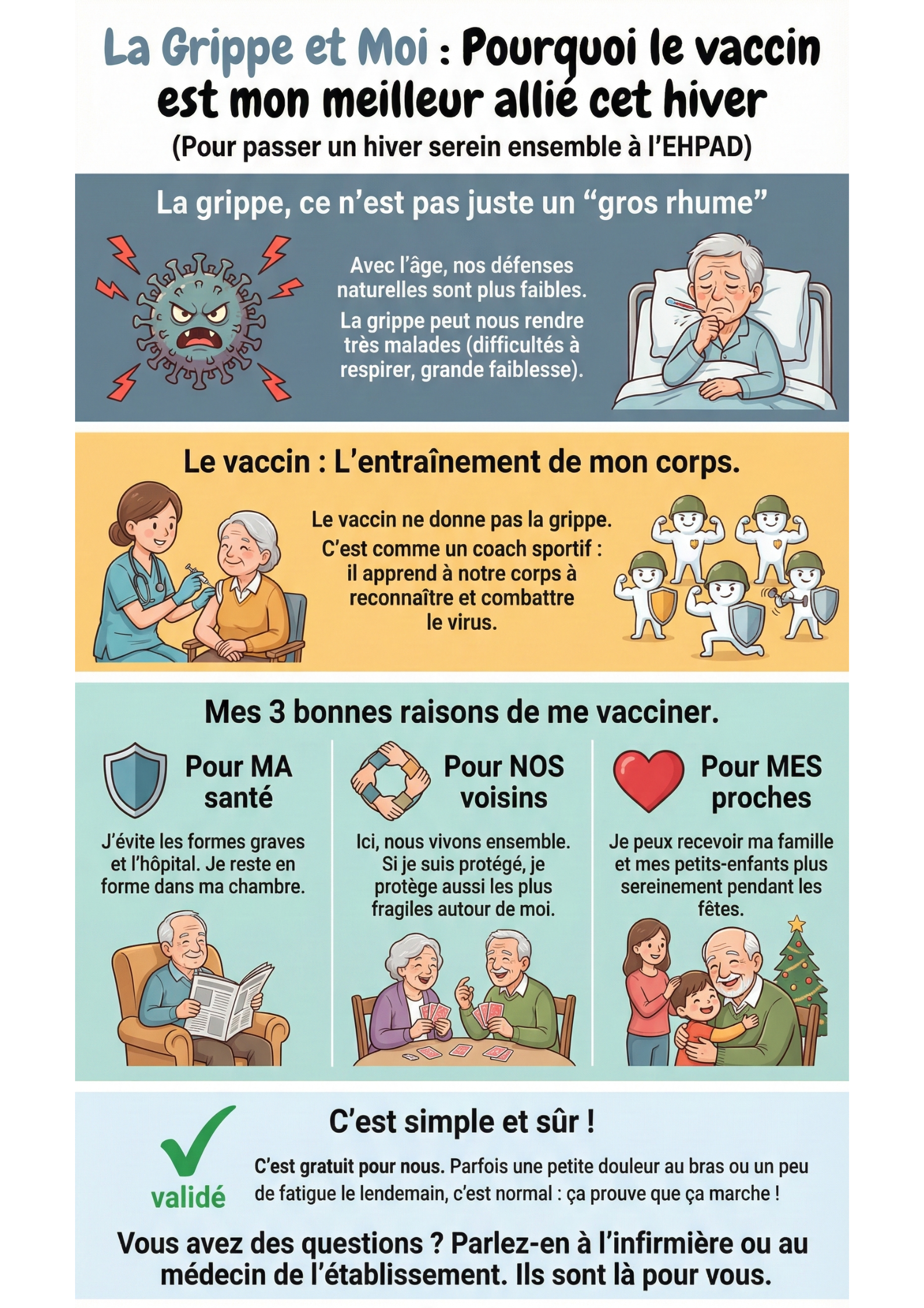 La plupart des EHPAD organisent déjà des campagnes vaccinales avec le médecin coordonnateur ou des médecins généralistes. L’obligation renforcera l’importance de :